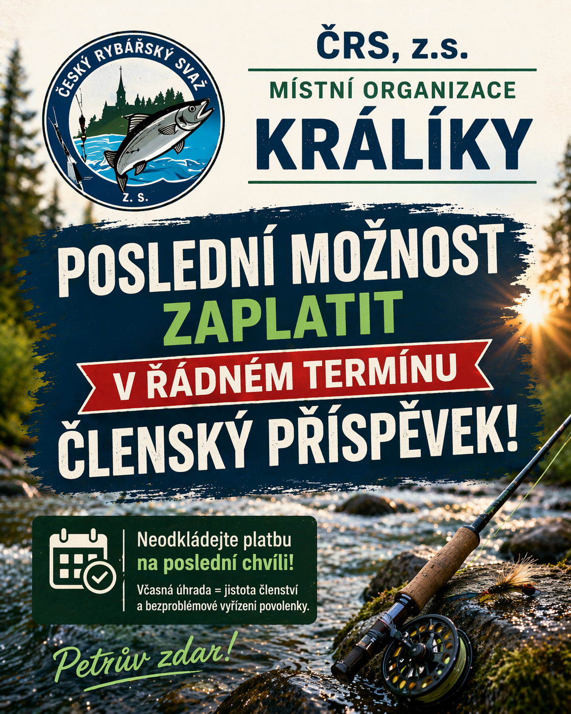 Vy, co ještě nemáte uhrazenu členskou povinnost, či si chcete zakoupit povolenku k lovu ryb, neváhejte a učiňte tak co možná nejdříve.