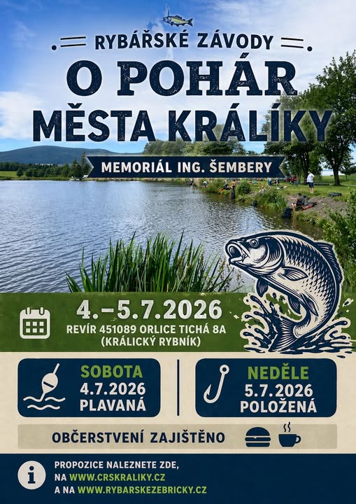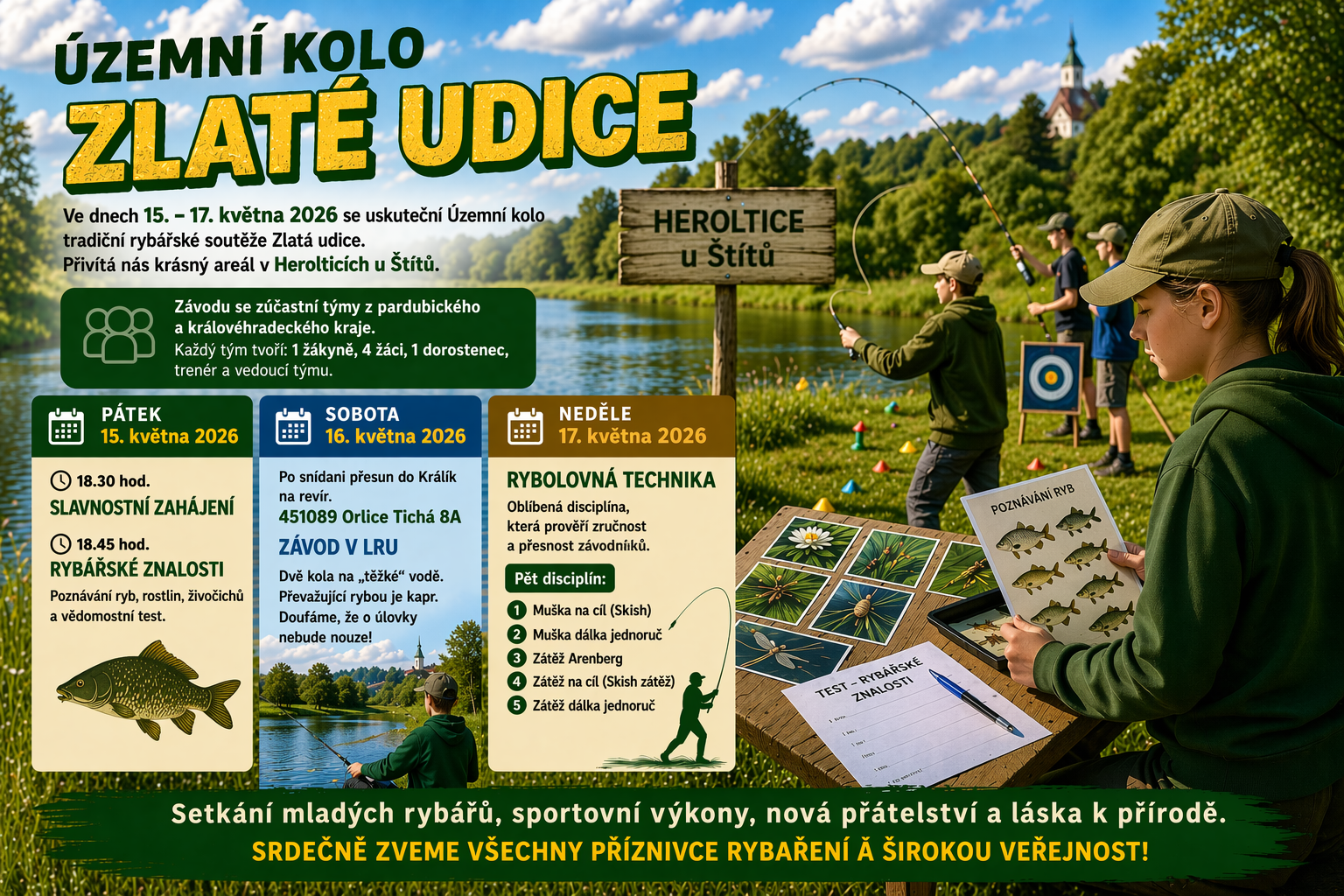 Ve dnech 15.–17. května 2026 se uskuteční tradiční Územní kolo rybářské soutěže Zlatá udice, které letos přivítá krásný areál společnosti Heroltické s.r.o. v Herolticích u Štítů.